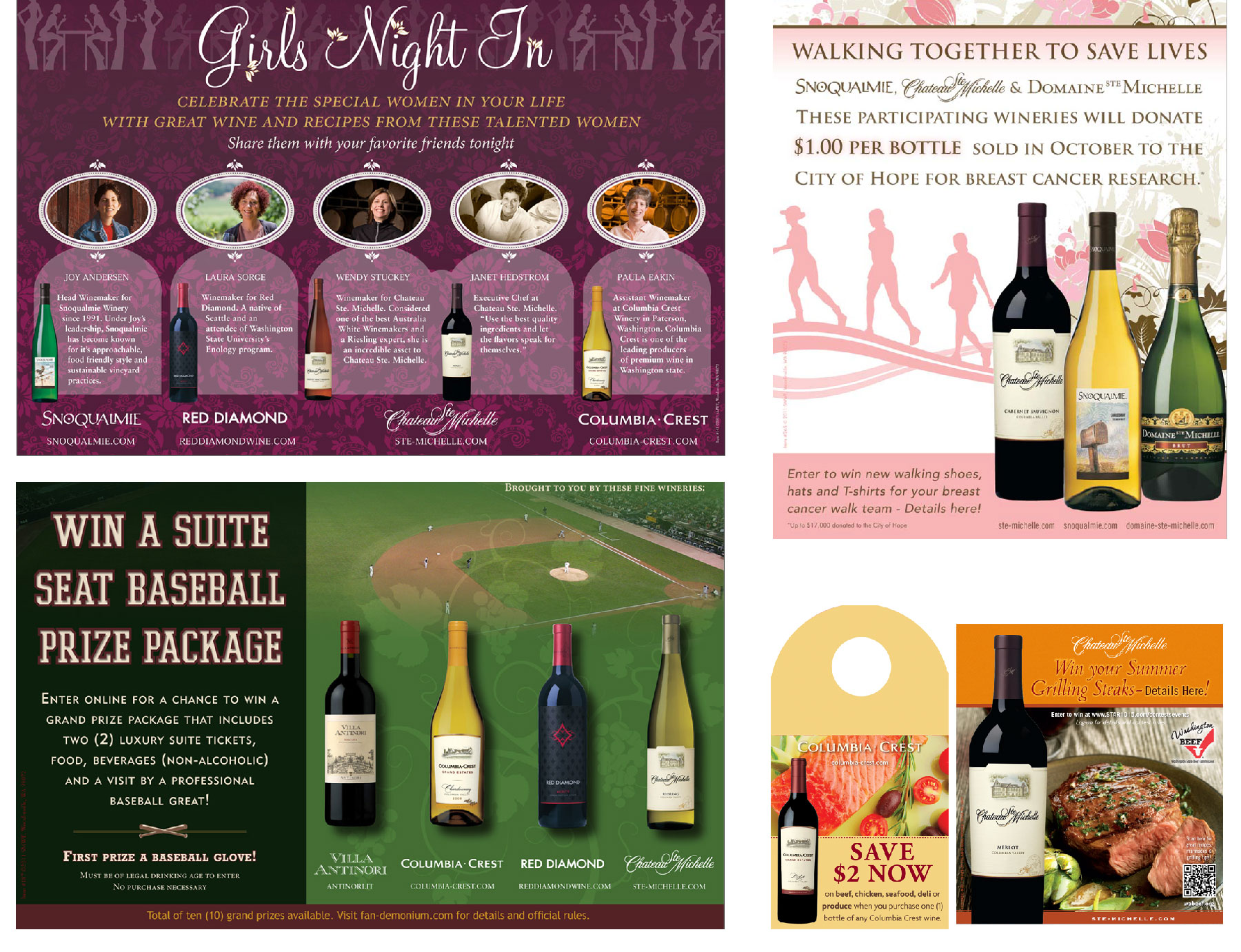 As a consultant at Chateau Ste. Michelle, I collaborated with multiple brand managers and promotional marketing staff to prepare and execute national advertisements, brochures, flyers, wine labels, signage, email campaigns, and PowerPoint presentations for over 14 brands.