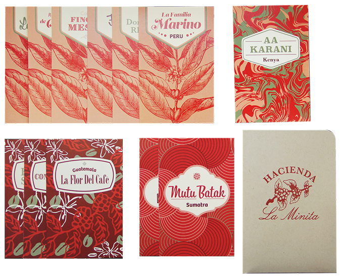 La Minita Coffee tasting cards were produced for our “Greens Team” in order to differentiate each coffee and group them by region. Producing 4 unique designs contained within the brands color scheme made each special yet unified as a collective. Details of each coffee on the flip side shares the coffee background and other key coffee notes. All cards fit in a side pocket of the passport themed booklet for additional note taking that they can reference for every coffee tasting!